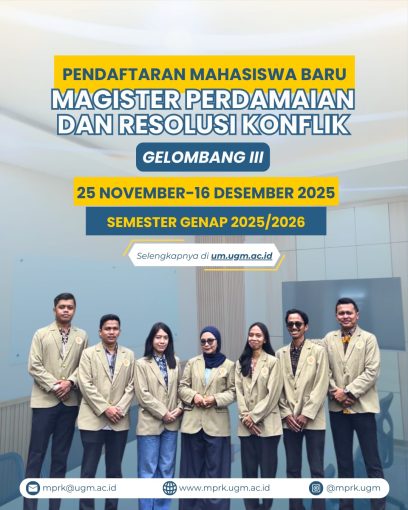 Program Studi Magister Perdamaian dan Resolusi Konflik (MPRK) Universitas Gadjah Mada (UGM) dengan bangga mengumumkan dibukanya kembali pendaftaran mahasiswa baru untuk Gelombang III Semester Genap Tahun Akademik 2025/2026.